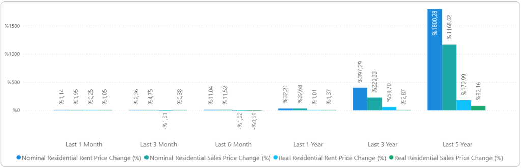 In December 2025, Turkey Residential Rent Prices increased by 1.14% in nominal terms and 0.25% in real terms compared to the previous month and also increased by 32.21% in nominal terms and 1.01% in real terms when compared to December 2024.
