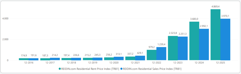 In December 2025, Turkey Residential Sales Prices increased by 1.95% in nominal terms and 1.05% in real terms compared to the previous month and also increased by 32.68% in nominal terms and 1.37% in real terms when compared to December 2024.
