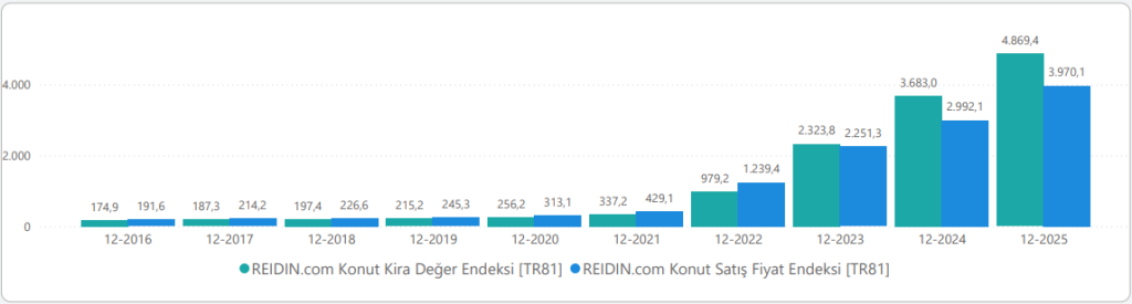 2025 Aralık ayında bir önceki aya göre nominal olarak 1.95% , reel olarak ise 1.05% oranında artan Türkiye Satılık Konut Fiyat Endeksi, bir önceki yılın aynı dönemine göre nominal olarak 32.68%, reel olarak ise 1.37% artmıştır.