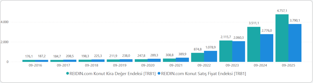 2025 Eylül ayında bir önceki aya göre nominal olarak 1.79% artan, reel olarak ise 1.40% oranında azalan Türkiye Satılık Konut Fiyat Endeksi, bir önceki yılın aynı dönemine göre nominal olarak 36.53%, reel olarak ise 2.43% artmıştır.