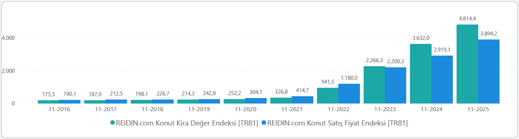 2025 Kasım ayında bir önceki aya göre nominal olarak 1.04% , reel olarak ise 0.17% oranında artan Türkiye Satılık Konut Fiyat Endeksi, bir önceki yılın aynı dönemine göre nominal olarak 33.41%, reel olarak ise 1.78% artmıştır.