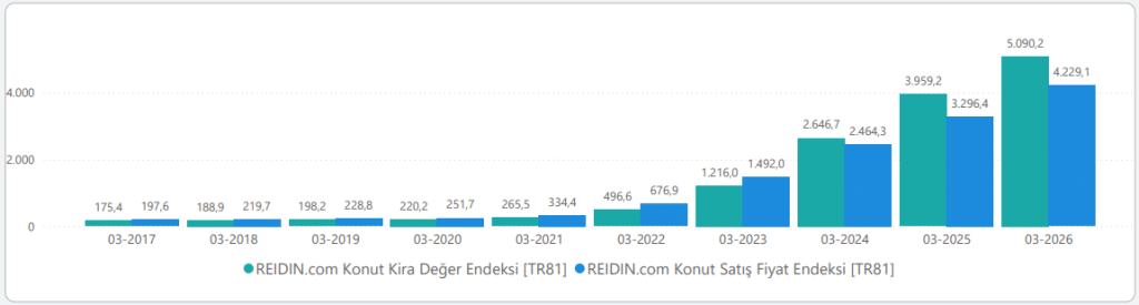2026 Mart ayında bir önceki aya göre nominal olarak 2.06%, reel olarak ise 0.12% oranında artan Türkiye Kiralık Konut Fiyat Endeksi, bir önceki yılın aynı dönemine göre nominal olarak 28.57% artmış, reel olarak ise 1.76% azalmıştır.