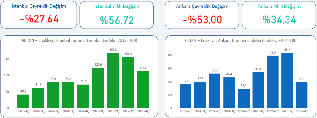 2017 yıl ortalamasının 100 olarak baz alındığı REIDIN – Enakliyat İstanbul Taşınma Endeksi, 2025 4. çeyrekte bir önceki çeyreğe göre 27.64% oranında azalış, geçen yılın aynı çeyrek dönemine göre de 56.72% oranında artış göstermiştir.