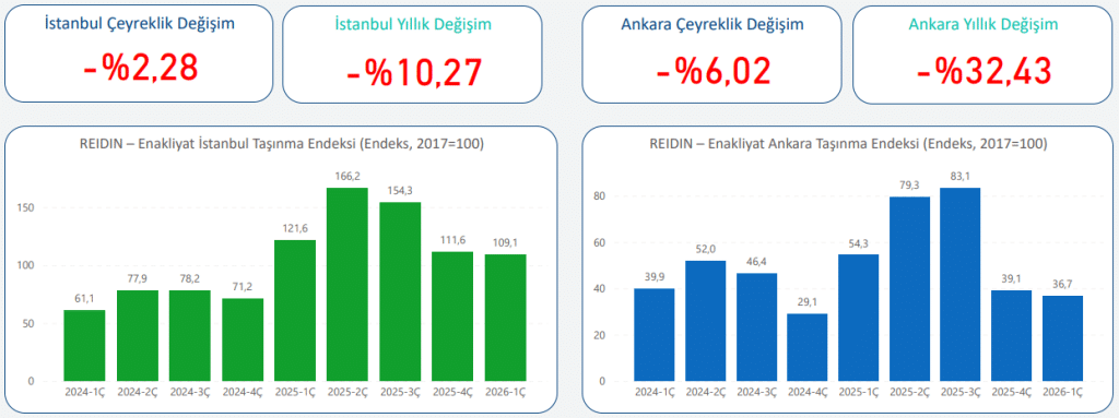 2017 yıl ortalamasının 100 olarak baz alındığı REIDIN – Enakliyat Ankara Taşınma Endeksi, 2026 1. çeyrekte bir önceki çeyreğe göre 6.02%, geçen yılın aynı çeyrek dönemine göre ise 32.43% oranında azalış göstermiştir.